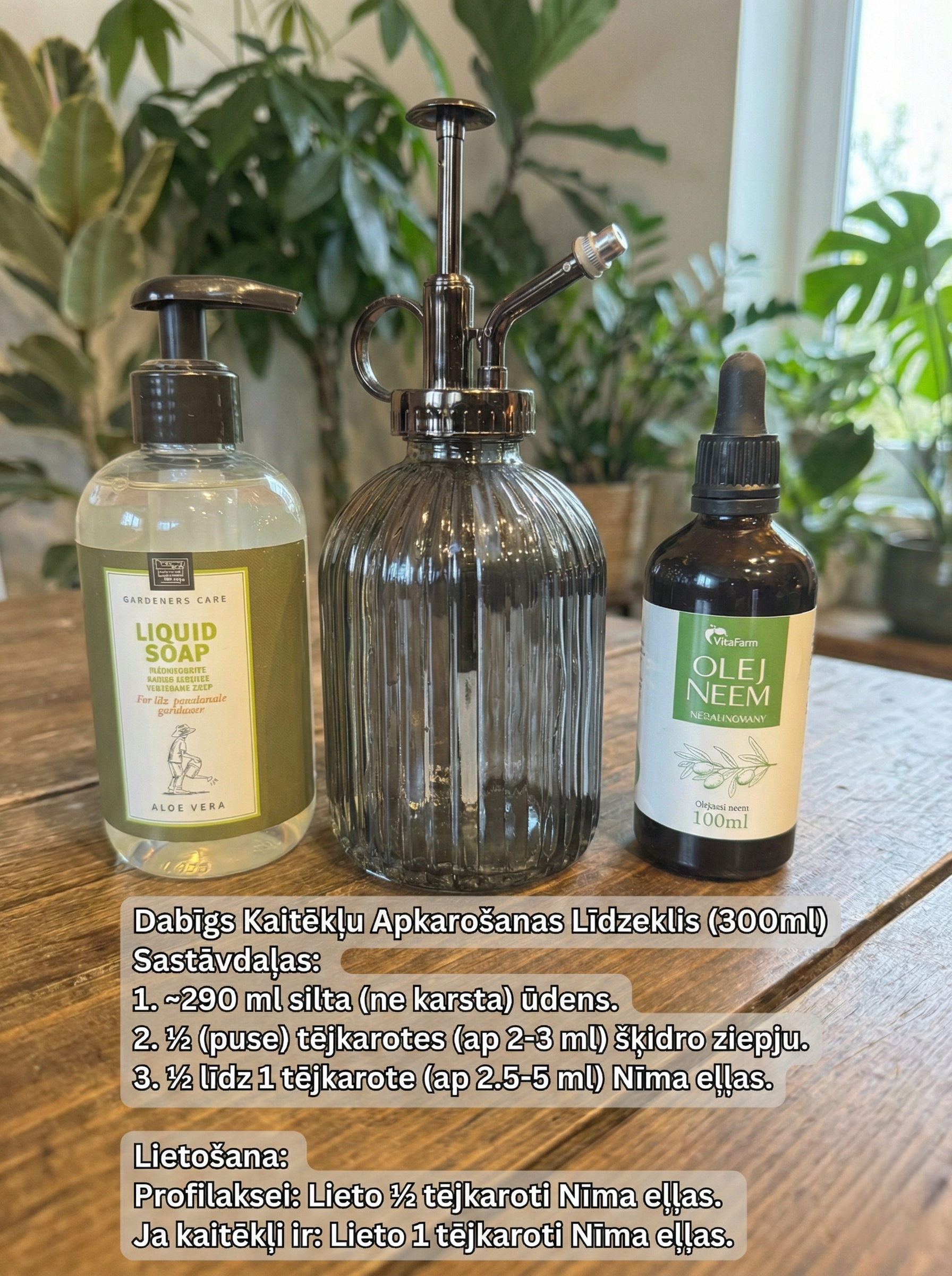 Spray the entire plant – leaves on both sides (especially the underside!), leaf axils, and stem. The remaining mixture can be poured into the soil to affect pest larvae.