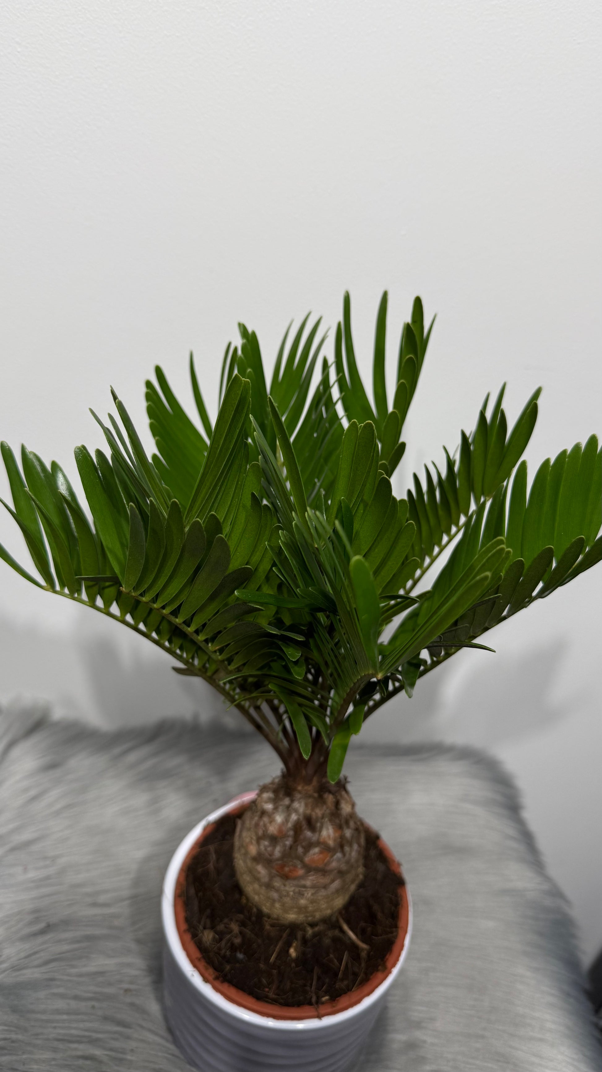 Iepazīstiet Zamia furfuracea, ko bieži dēvē arī par "Kartonpapīra palmu" tās neparasto, stingro un samtaino lapu dēļ. Šis telpaugs ir izcils elements modernam interjeram, jo tā lēnā augšana un skulpturālais izskats saglabā formu gadiem ilgi. Tā ir ideāla dāvana aizņemtiem cilvēkiem vai minimālisma cienītājiem, jo zamija ir neticami izturīga un spēj paciest dažādus apstākļus, vienlaikus piešķirot telpai eksotisku raksturu.